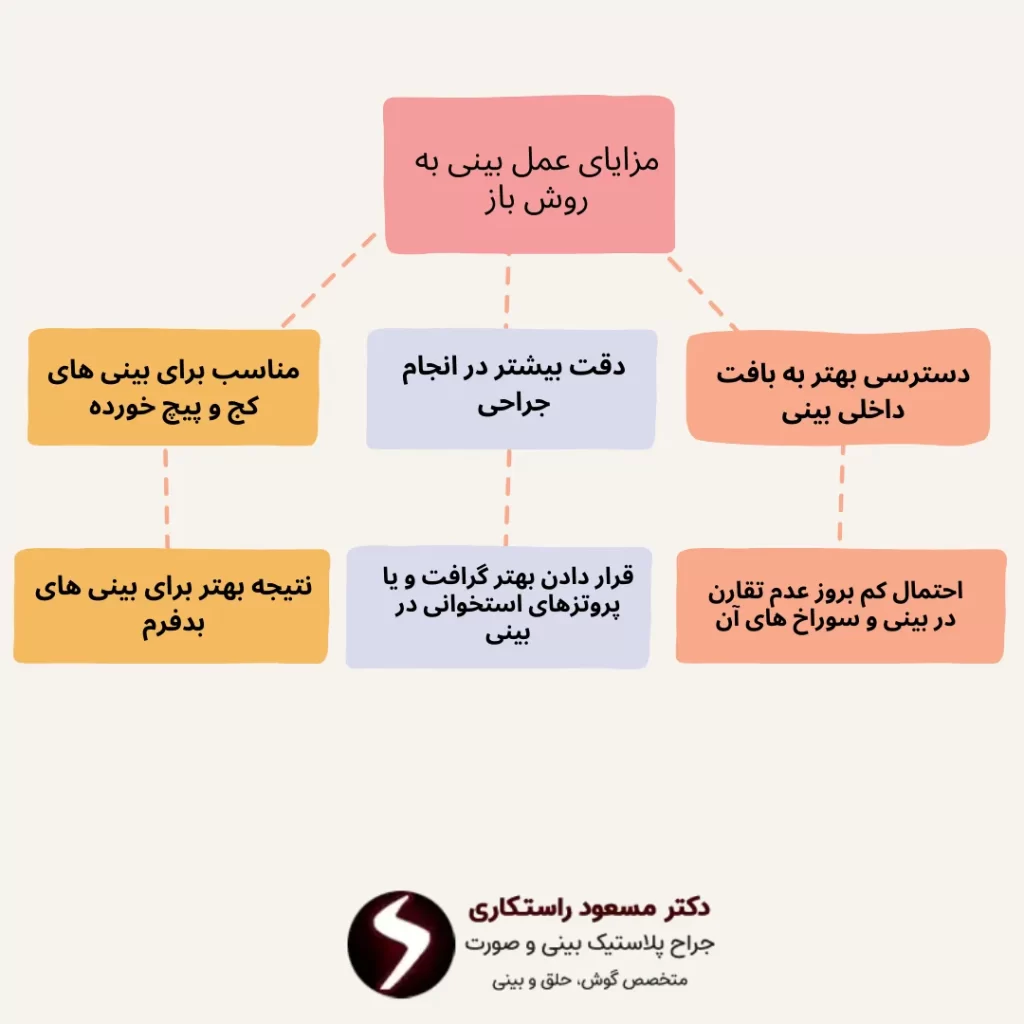 بهطورکلی اگرچه جراحی باز بینی، نسبت به عمل بسته عوارض بیشتری دارد؛ اما تسلط پزشک را افزایش میدهد و برای جراحیهای پیچیدهتر، گزینه مناسبتری به شمار میآید.